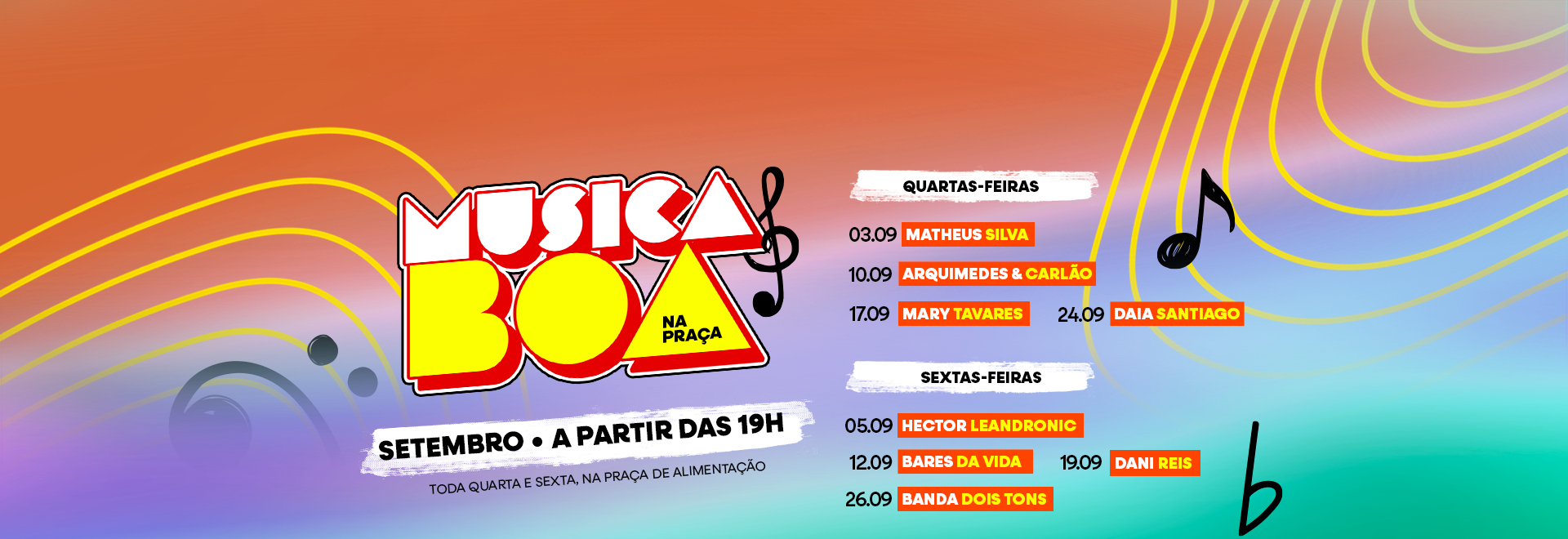 A partir das 19h, artistas locais sobem ao palco da Praça de Alimentação pra transformar suas noites em momentos de puro prazer e boa música! ✨
